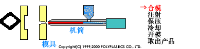 1、合模 2、射出 3、保壓 4、冷卻 5、開模 6、取出產品