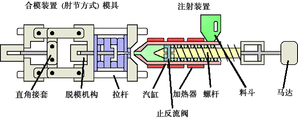 合模裝置是開閉模具以執行脫模作業,而且也有如圖所示的肘桿方式,以及利用油壓缸直接開閉模具的直壓方式。注射裝置是將樹脂予以加熱融化後再射入模具內此時,要旋轉螺桿,并如圖所示讓投入到料斗的樹脂停留在螺桿前端,經過相當于所需樹脂量的行程儲藏後再進行射出。當樹脂在模具內流動時,則控制螺桿的移動速度并在填充樹脂後用壓力(保壓力)進行控制。當達到一定的螺桿位置或一定射出壓力時則從速度控制切換成壓力控制。